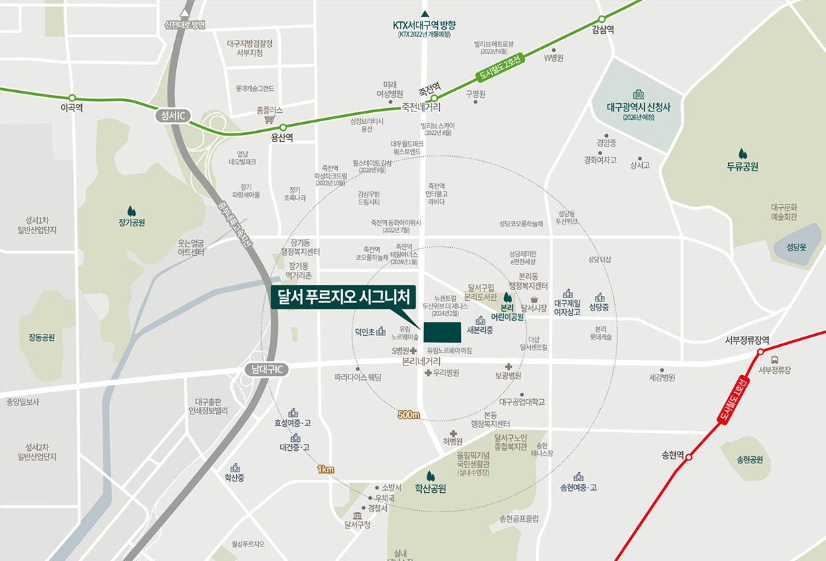 단지 앞 죽전역, 성당못역 남대구 ic, 성서 ic 등 편리한 광역교통망과